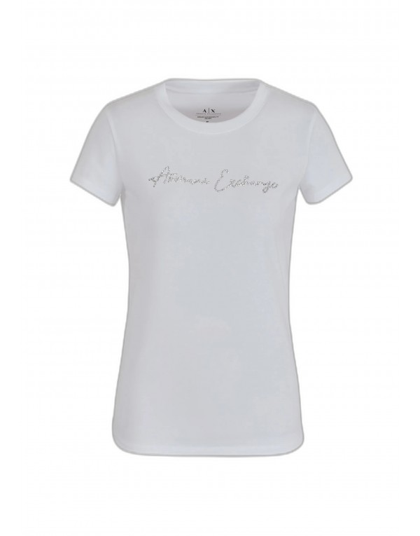 Brand: Armani Exchange Gender: Women Type: T-shirts Season: Spring/Summer PRODUCT DETAIL • Color: white • Pattern: print • Fastening: slip on • Sleeves: short • Neckline: round neck COMPOSITION AND MATERIAL • Composition: -95% cotton -5% elastane • Washing: machine wash at 30°