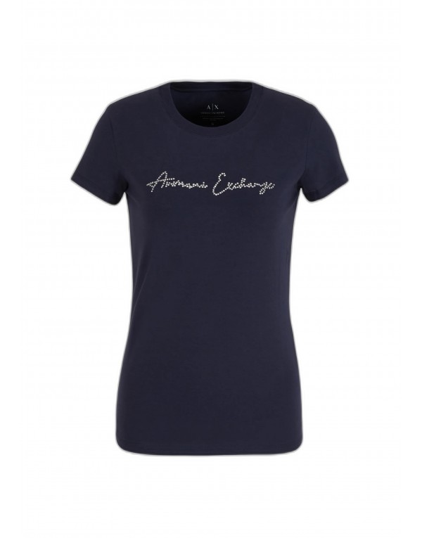 Brand: Armani Exchange Gender: Women Type: T-shirts Season: Spring/Summer PRODUCT DETAIL • Color: blue • Pattern: print • Fastening: slip on • Sleeves: short • Neckline: round neck COMPOSITION AND MATERIAL • Composition: -95% cotton -5% elastane • Washing: machine wash at 30°