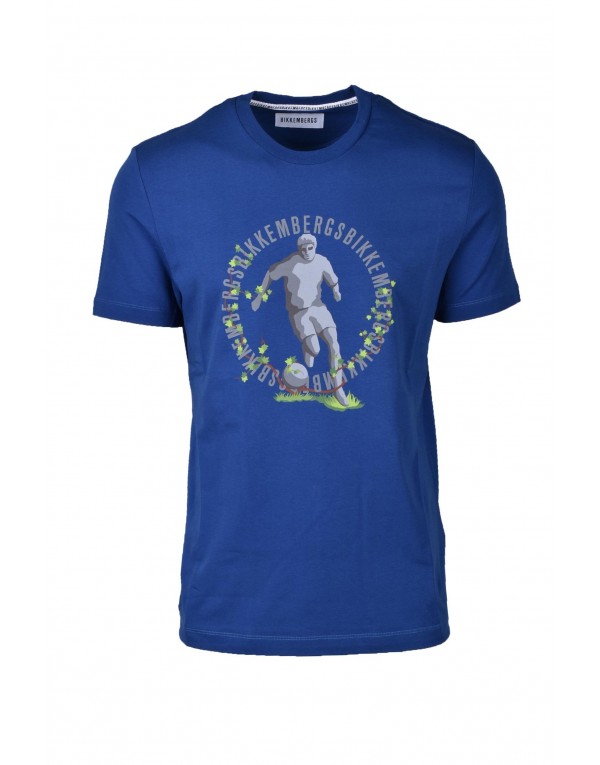 Brand: Bikkembergs Gender: Men Type: T-shirts Season: Spring/Summer PRODUCT DETAIL • Color: blue • Pattern: print • Sleeves: short • Neckline: round neck COMPOSITION AND MATERIAL • Composition: -95% cotton -5% elastane • Washing: machine wash at 30°