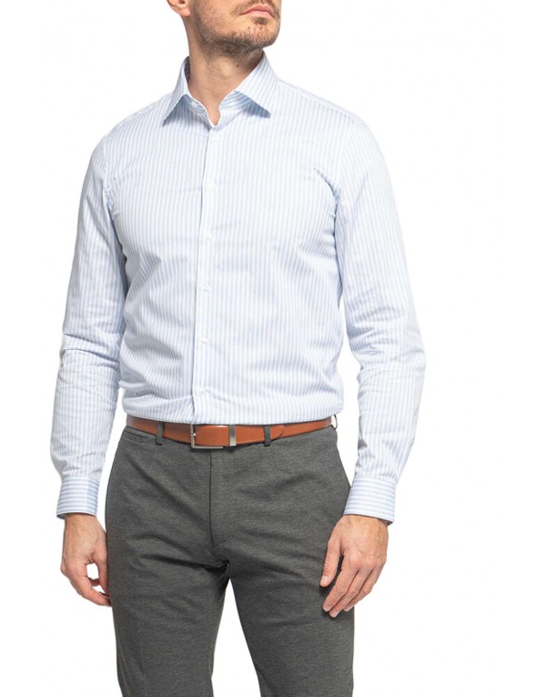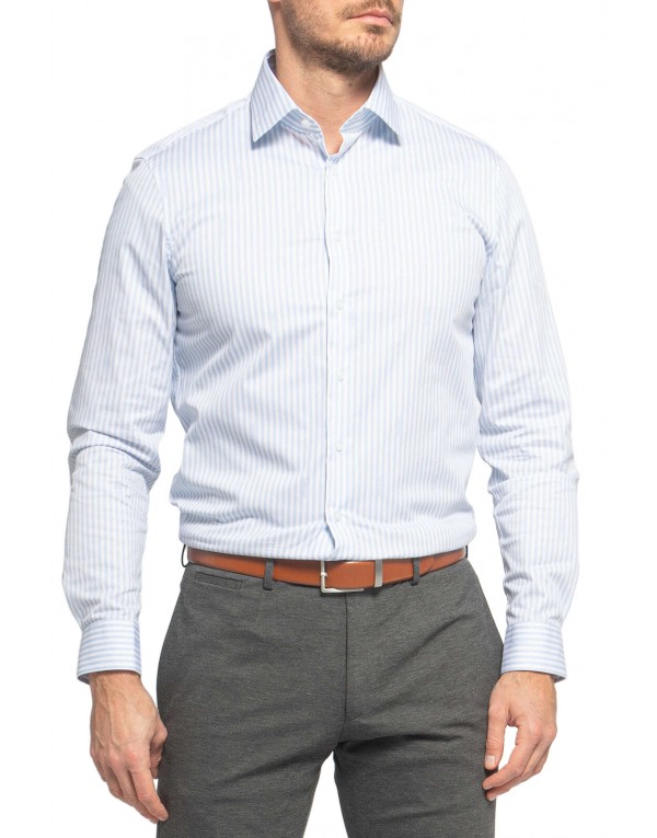 Brand: Calvin Klein Gender: Men Type: Shirts Season: Fall/Winter PRODUCT DETAIL • Color: light blue • Pattern: striped • Fastening: buttons • Sleeves: long • Neckline: round neck • Collar: classic COMPOSITION AND MATERIAL • Composition: -96% cotton -4% elastane • Washing: machine wash at 30°