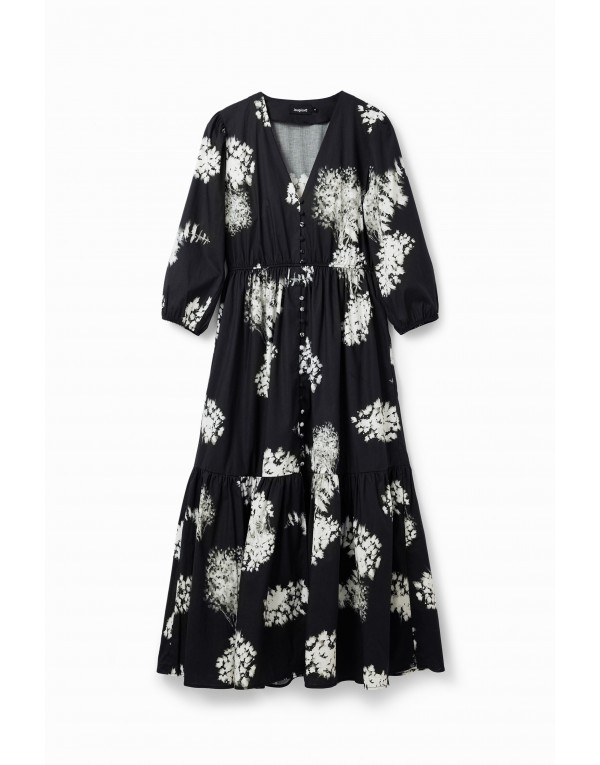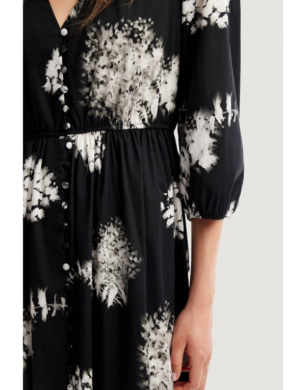 Brand: Desigual Gender: Women Type: Dresses Season: Fall/Winter PRODUCT DETAIL • Color: black • Pattern: print • Fastening: buttons • Sleeves: long • Neckline: low-cut v-neck COMPOSITION AND MATERIAL • Composition: -98% cotton -2% elastane • Washing: machine wash at 30°