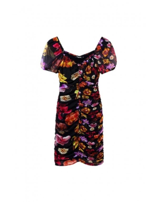 Brand: Desigual Gender: Women Type: Dresses Season: Spring/Summer PRODUCT DETAIL • Color: black • Pattern: floral • Fastening: with zip • Sleeves: short • Neckline: v-neck COMPOSITION AND MATERIAL • Composition: -7% elastane -93% polyester • Washing: machine wash at 30°