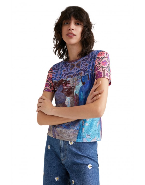Brand: Desigual Gender: Women Type: T-shirts Season: Spring/Summer PRODUCT DETAIL • Color: blue • Pattern: coloured • Sleeves: short • Neckline: round neck COMPOSITION AND MATERIAL • Composition: -3% elastane -91% polyester -6% various • Washing: machine wash at 30°