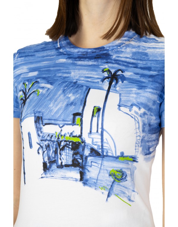 Brand: Desigual Gender: Women Type: T-shirts Season: Spring/Summer PRODUCT DETAIL • Color: blue • Pattern: coloured • Sleeves: short • Neckline: round neck COMPOSITION AND MATERIAL • Composition: -95% cotton -5% elastane • Washing: machine wash at 30°