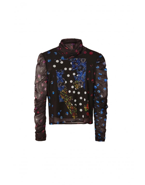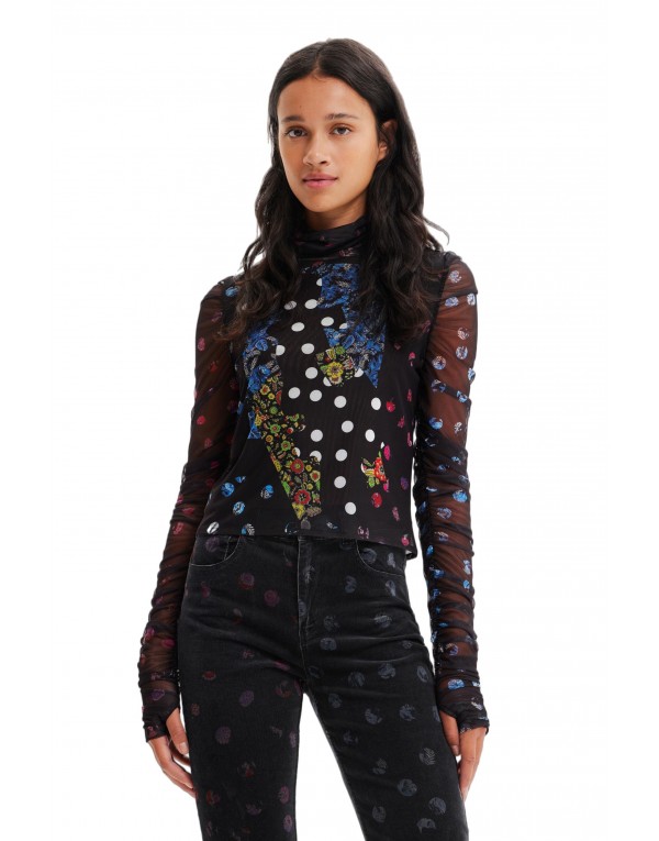Brand: Desigual Gender: Women Type: T-shirts Season: Fall/Winter PRODUCT DETAIL • Color: black • Pattern: print • Sleeves: long • Neckline: turtleneck COMPOSITION AND MATERIAL • Composition: -7% lycra -93% polyester • Washing: machine wash at 30°