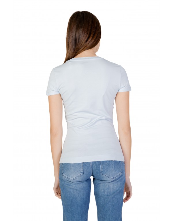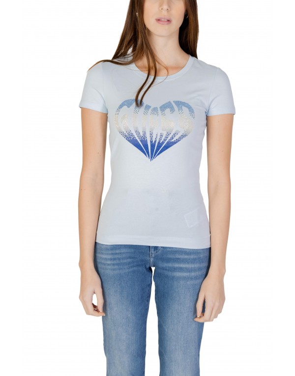 Brand: Guess Gender: Women Type: T-shirts Season: Spring/Summer PRODUCT DETAIL • Color: light blue • Pattern: print • Sleeves: short • Neckline: round neck • Details: -rhinestones COMPOSITION AND MATERIAL • Composition: -95% cotton -5% elastane • Washing: machine wash at 30°