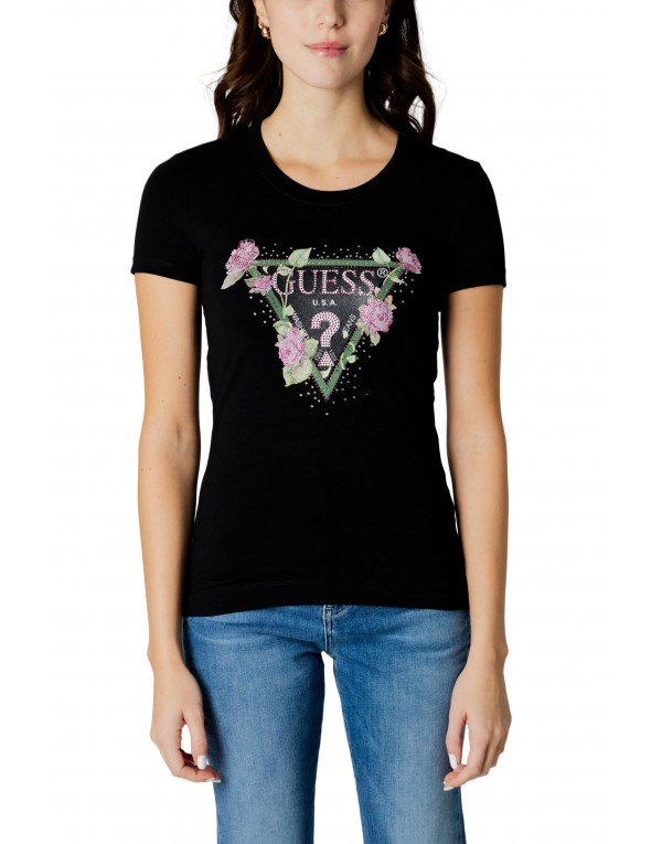 Brand: Guess Gender: Women Type: T-shirts Season: Spring/Summer PRODUCT DETAIL • Color: black • Pattern: print • Fastening: slip on • Sleeves: short • Neckline: round neck COMPOSITION AND MATERIAL • Composition: -95% cotton -5% elastane • Washing: machine wash at 30°
