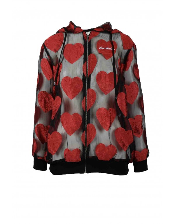 Brand: Love Moschino Gender: Women Type: Blazer Season: Spring/Summer PRODUCT DETAIL • Color: black • Pattern: print • Fastening: with zip • Collar: hood COMPOSITION AND MATERIAL • Composition: -45% polyester -55% viscose