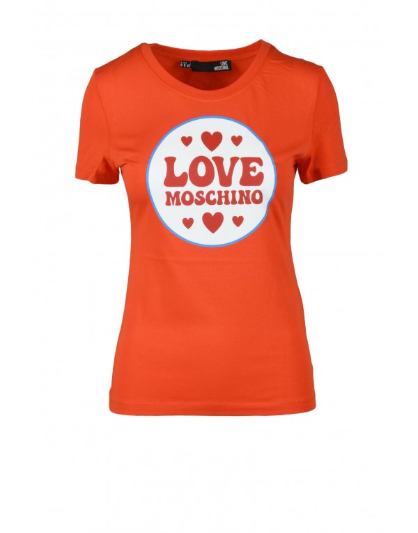 Brand: Love Moschino Gender: Women Type: T-shirts Season: Spring/Summer PRODUCT DETAIL • Color: orange • Pattern: print • Sleeves: short • Neckline: round neck COMPOSITION AND MATERIAL • Composition: -95% cotton -5% elastane • Washing: machine wash at 30°