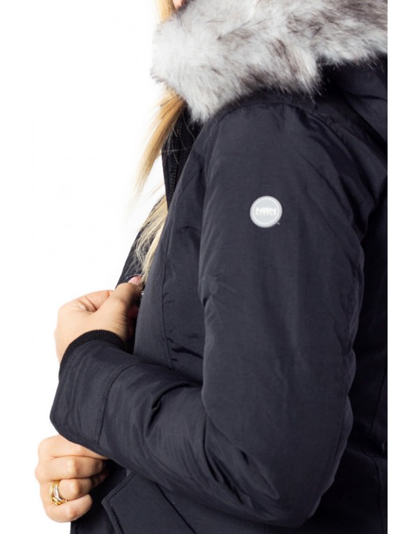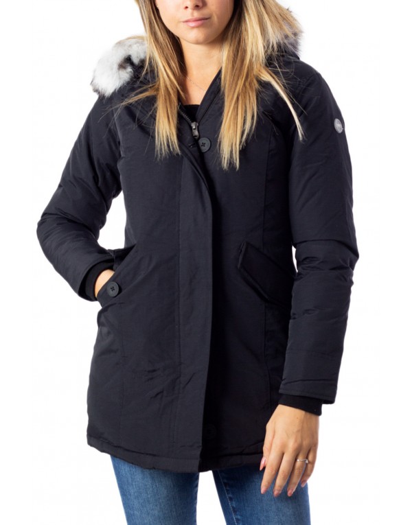 Brand: No Zone Gender: Women Type: Jackets Season: Fall/Winter PRODUCT DETAIL • Color: black • Fastening: zip and button • Sleeves: long • Collar: hood • Pockets: front pockets COMPOSITION AND MATERIAL • Composition: -100% polyester • Washing: dry cleaned