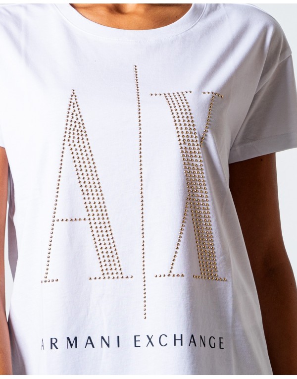 Brand: Armani Exchange Gender: Women Type: T-shirts Season: Fall/Winter PRODUCT DETAIL • Color: white • Pattern: print • Sleeves: short • Neckline: round neck COMPOSITION AND MATERIAL • Composition: -100% cotton • Washing: machine wash at 30°