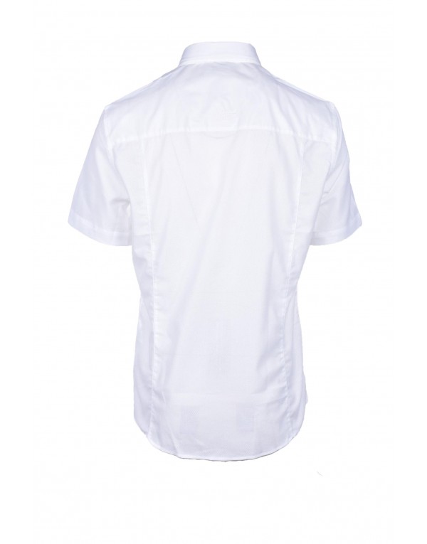Brand: Bikkembergs Gender: Men Type: Shirts Season: Spring/Summer PRODUCT DETAIL • Color: white • Pattern: plain • Fastening: buttons • Sleeves: short • Collar: classic COMPOSITION AND MATERIAL • Composition: -98% cotton -2% elastane • Washing: machine wash at 30°