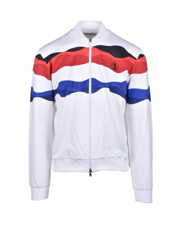 Brand: Bikkembergs Gender: Men Type: Sweatshirts Season: Spring/Summer PRODUCT DETAIL • Color: white • Pattern: print • Fastening: with zip • Sleeves: long • Neckline: round neck COMPOSITION AND MATERIAL • Composition: -95% cotton -5% elastane • Washing: machine wash at 30°