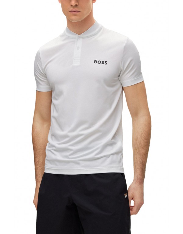 Brand: Boss Gender: Men Type: Polo Season: Spring/Summer PRODUCT DETAIL • Color: white • Pattern: plain • Fastening: buttons • Sleeves: short • Collar: mandarin COMPOSITION AND MATERIAL • Composition: -8% elastane -92% polyester • Washing: machine wash at 30°