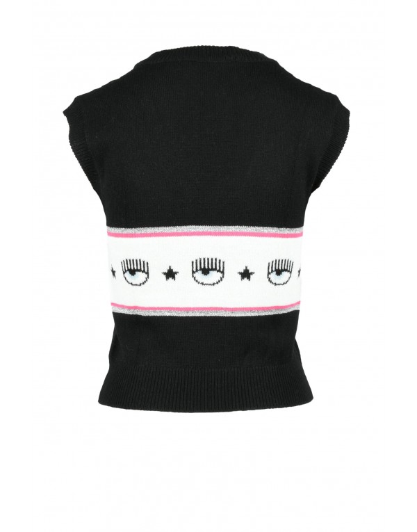 Brand: Chiara Ferragni Gender: Women Type: Knitwear Season: Fall/Winter PRODUCT DETAIL • Color: black • Pattern: print • Fastening: slip on • Sleeves: sleeveless • Neckline: v-neck COMPOSITION AND MATERIAL • Composition: -5% cashmere -25% wool -30% polyamide -40% viscose • Washing: handwash