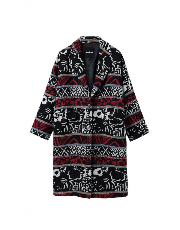 Brand: Desigual Gender: Women Type: Coats Season: Fall/Winter PRODUCT DETAIL • Color: black • Pattern: print • Fastening: buttons • Collar: lapel collar COMPOSITION AND MATERIAL • Composition: -38% acrylic -2% other fibres -25% cotton -35% polyester