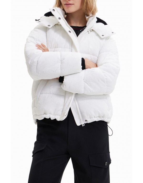 Brand: Desigual Gender: Women Type: Jackets Season: Fall/Winter PRODUCT DETAIL • Color: white • Pattern: plain • Fastening: zip and automatic buttons • Sleeves: long • Collar: hood • Pockets: front pockets COMPOSITION AND MATERIAL • Composition: -41% polyamide -59% polyester • Washing: dry cleaned