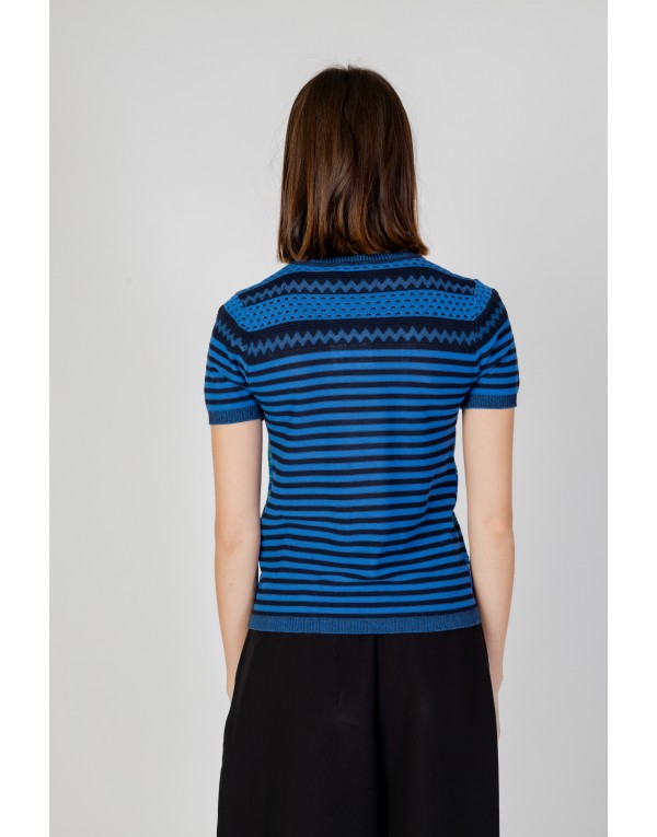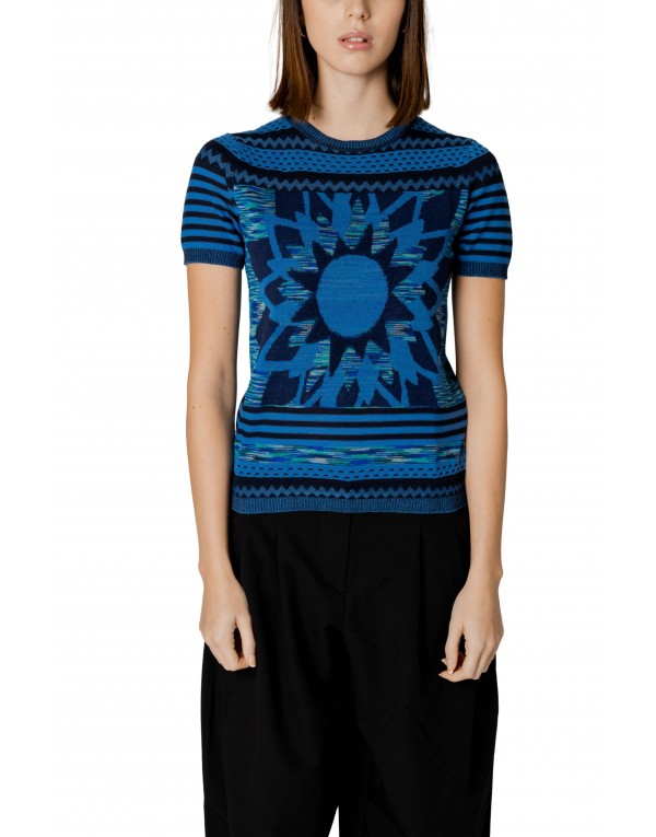 Brand: Desigual Gender: Women Type: Knitwear Season: Spring/Summer PRODUCT DETAIL • Color: blue • Pattern: print • Fastening: slip on • Sleeves: short • Neckline: round neck COMPOSITION AND MATERIAL • Composition: -65% cotton -28% polyamide -7% polyester • Washing: machine wash at 30°