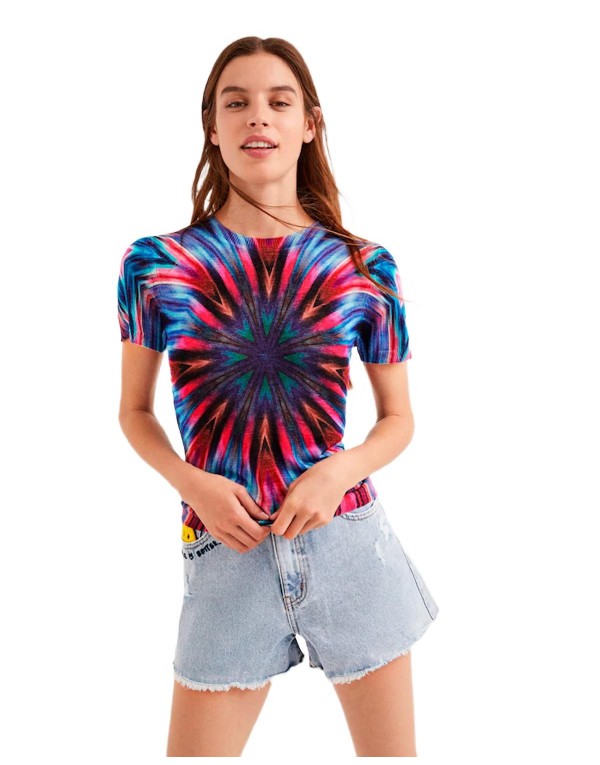 Brand: Desigual Gender: Women Type: Knitwear Season: Spring/Summer PRODUCT DETAIL • Color: light blue • Pattern: coloured • Sleeves: short • Neckline: round neck COMPOSITION AND MATERIAL • Composition: -100% cotton • Washing: machine wash at 30°