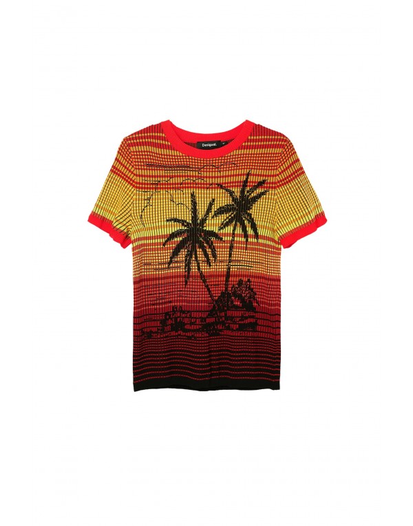 Brand: Desigual Gender: Women Type: Knitwear Season: Spring/Summer PRODUCT DETAIL • Color: orange • Pattern: coloured • Sleeves: short • Neckline: round neck COMPOSITION AND MATERIAL • Composition: -72% rayon -28% viscose • Washing: machine wash at 30°