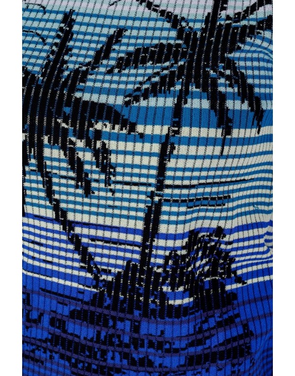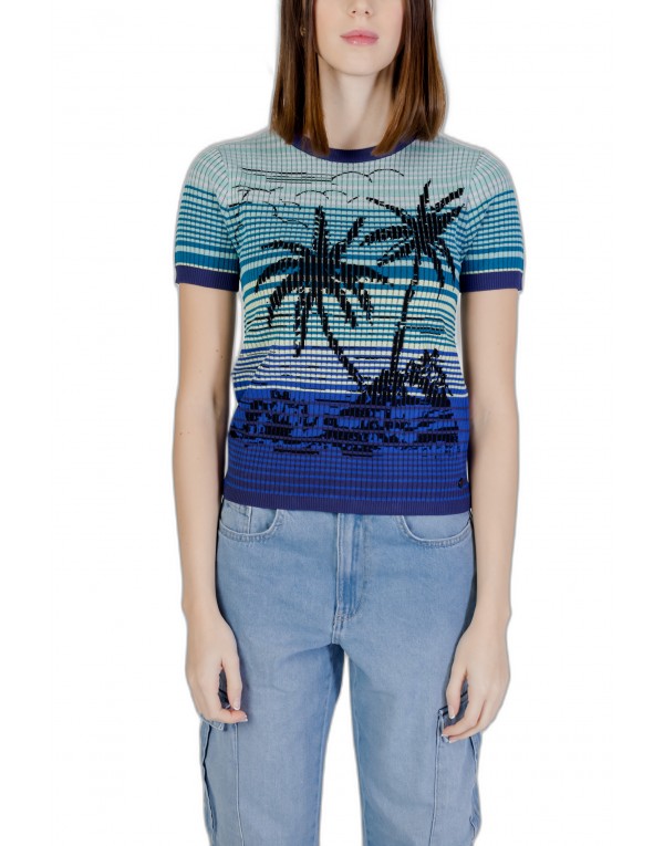 Brand: Desigual Gender: Women Type: Knitwear Season: Spring/Summer PRODUCT DETAIL • Color: blue • Pattern: print • Sleeves: short • Neckline: round neck COMPOSITION AND MATERIAL • Composition: -72% rayon -28% viscose • Washing: machine wash at 30°