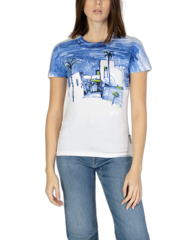 Brand: Desigual Gender: Women Type: T-shirts Season: Spring/Summer PRODUCT DETAIL • Color: blue • Pattern: coloured • Sleeves: short • Neckline: round neck COMPOSITION AND MATERIAL • Composition: -95% cotton -5% elastane • Washing: machine wash at 30°