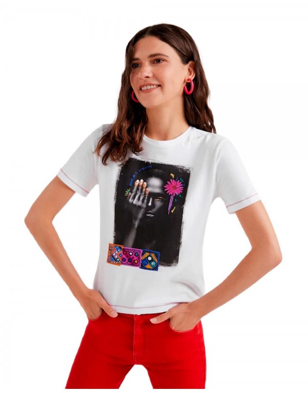 Brand: Desigual Gender: Women Type: T-shirts Season: Spring/Summer PRODUCT DETAIL • Color: white • Pattern: print • Sleeves: short • Neckline: round neck COMPOSITION AND MATERIAL • Composition: -95% cotton -5% elastane • Washing: machine wash at 30°