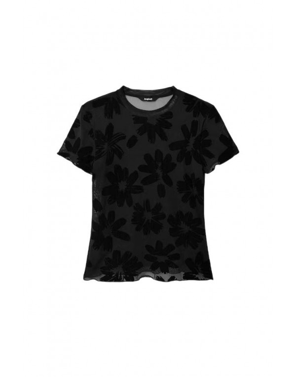 Brand: Desigual Gender: Women Type: T-shirts Season: Spring/Summer PRODUCT DETAIL • Color: black • Pattern: floral • Fastening: slip on • Sleeves: short • Neckline: round neck COMPOSITION AND MATERIAL • Composition: -7% elastane -93% polyester • Washing: machine wash at 30°