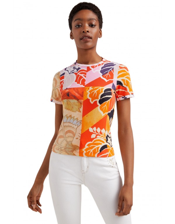 Brand: Desigual Gender: Women Type: T-shirts Season: Spring/Summer PRODUCT DETAIL • Color: orange • Pattern: floral • Sleeves: short • Neckline: round neck COMPOSITION AND MATERIAL • Composition: -8% elastane -92% polyamide • Washing: machine wash at 30°
