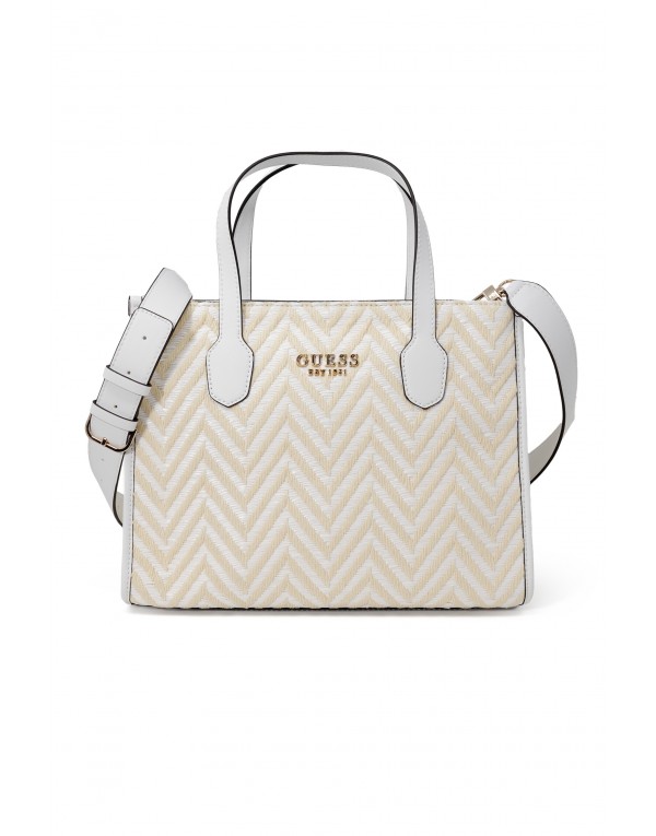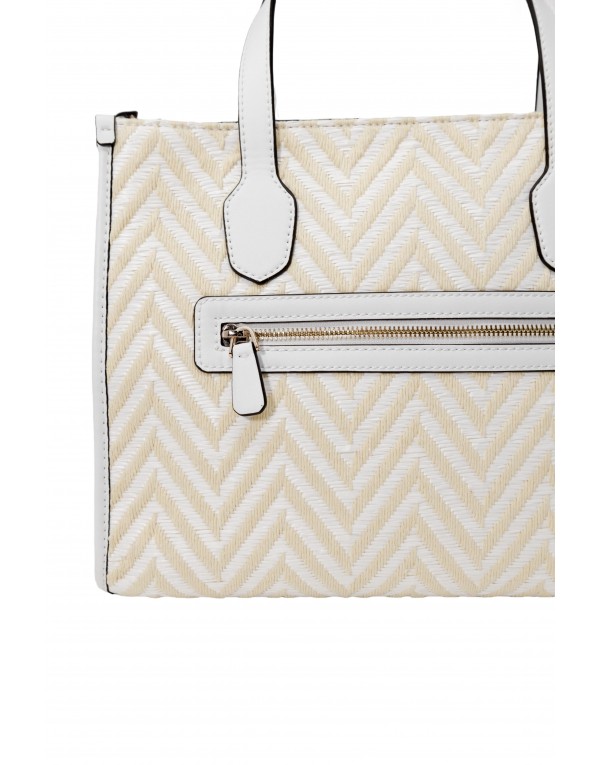 Brand: Guess Gender: Women Type: Bags Season: Spring/Summer PRODUCT DETAIL • Color: white • Pattern: striped • Fastening: with zip • Pockets: zip pockets • Size (cm): 26x32x12 • Details: -handbag -with shoulder strap COMPOSITION AND MATERIAL • Composition: -11% other fibres -18% cotton -71% polyester