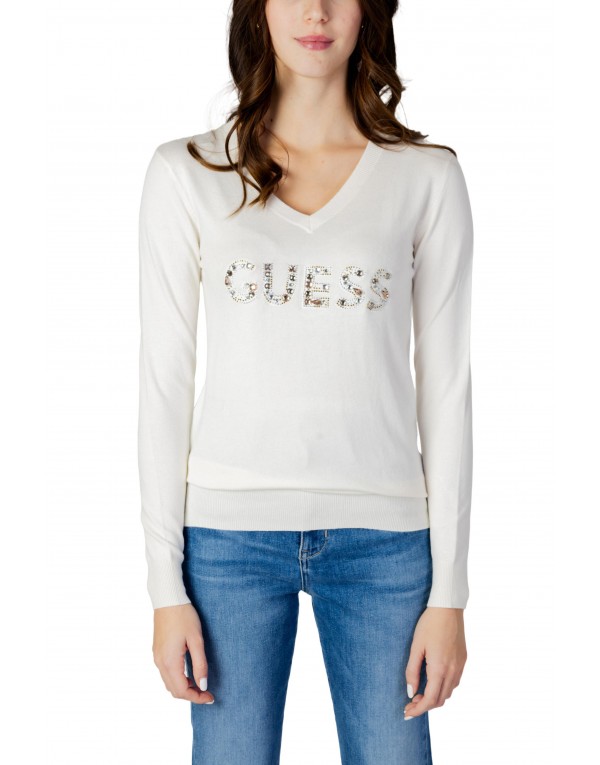 Brand: Guess Gender: Women Type: Knitwear Season: Spring/Summer PRODUCT DETAIL • Color: white • Pattern: print • Fastening: slip on • Sleeves: long • Neckline: v-neck COMPOSITION AND MATERIAL • Composition: -2% elastane -16% polyurethane -82% viscose • Washing: machine wash at 30°