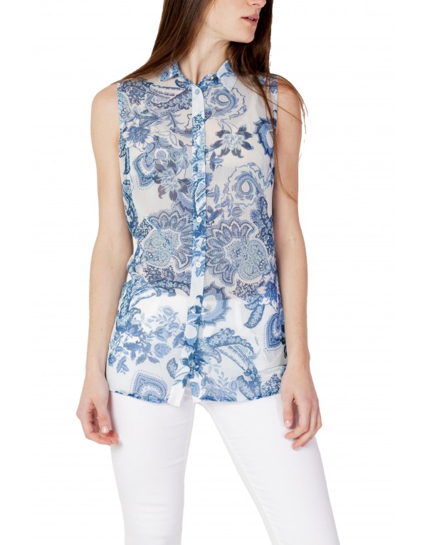 Brand: Guess Gender: Women Type: Shirts Season: Spring/Summer PRODUCT DETAIL • Color: blue • Pattern: print • Fastening: buttons • Sleeves: sleeveless • Collar: classic COMPOSITION AND MATERIAL • Composition: -100% polyester • Washing: machine wash at 30°