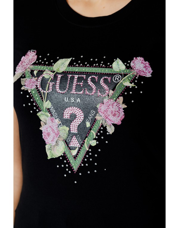 Brand: Guess Gender: Women Type: T-shirts Season: Spring/Summer PRODUCT DETAIL • Color: black • Pattern: print • Fastening: slip on • Sleeves: short • Neckline: round neck COMPOSITION AND MATERIAL • Composition: -95% cotton -5% elastane • Washing: machine wash at 30°