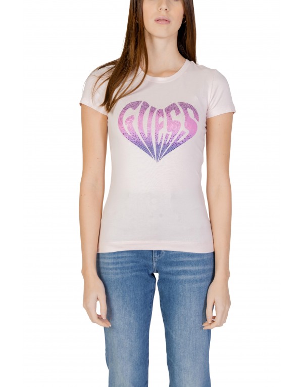 Brand: Guess Gender: Women Type: T-shirts Season: Spring/Summer PRODUCT DETAIL • Color: pink • Pattern: print • Sleeves: short • Neckline: round neck • Details: -rhinestones COMPOSITION AND MATERIAL • Composition: -95% cotton -5% elastane • Washing: machine wash at 30°