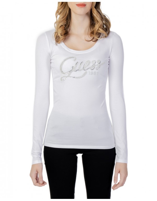 Brand: Guess Gender: Women Type: T-shirts Season: Fall/Winter PRODUCT DETAIL • Color: white • Pattern: print • Sleeves: long • Neckline: round neck COMPOSITION AND MATERIAL • Composition: -95% cotton -5% elastane • Washing: machine wash at 30°